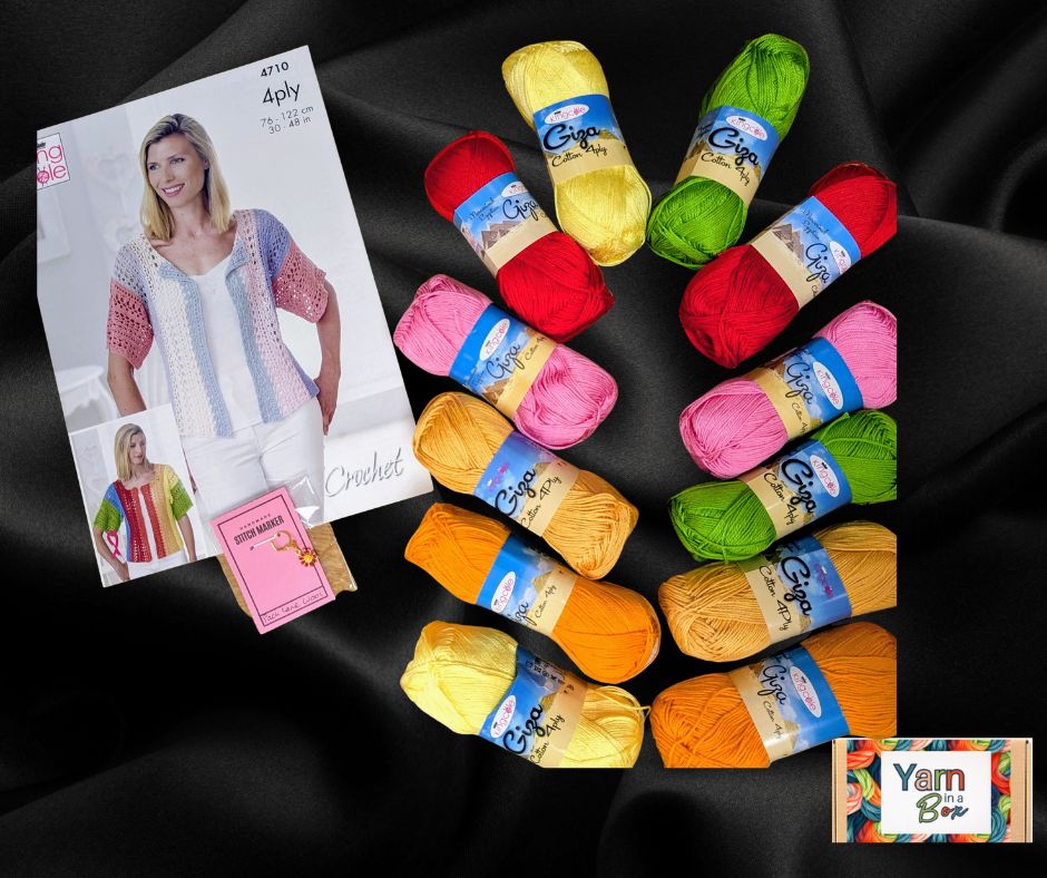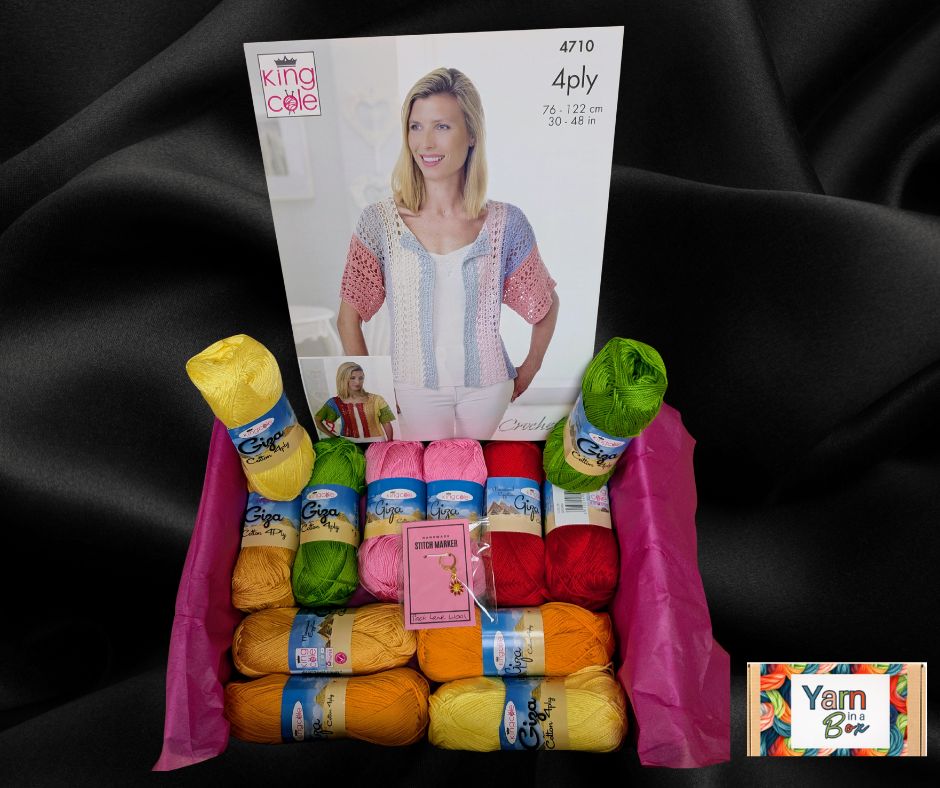 The 4 Ply Giga Cotton Crochet Box provides 100% cotton yarn for creating expertly crafted cardigan or jumper up to 122cm (48") in size. This 4 ply yarn offers excellent stitch definition and durability, ideal for detailed crochet work. Perfect for crocheters seeking breathable, comfortable, and long-lasting garments.